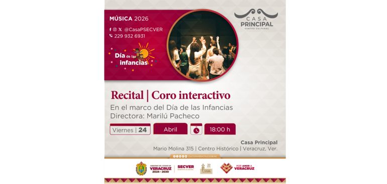 Xalapa, Ver., martes 21 de abril de 2026.- En el marco del Día de las Infancias, la Secretaría de Cultura de Veracruz (SECVER) invita al Recital Coro Interactivo, a cargo de Marilú Pacheco, el viernes 24 de abril a las 18:00 horas, en el Centro Cultural Casa Principal, en la ciudad de Veracruz. La entrada es gratuita. La actividad, dirigida a niñas y niños a partir de 8 años, tiene como objetivo fomentar un acercamiento lúdico y formativo a la […]