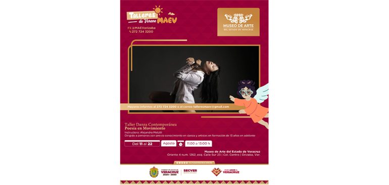 Xalapa, Ver., sábado 09 de agosto de 2025.- La Secretaría de Cultura de Veracruz (SECVER) y la Red de Escuelas de Iniciación Artística Asociadas al INBAL de la región Altas Montañas, invitan al Taller Integral de Artes, que se llevará a cabo del lunes 11 al jueves 28 de agosto, y al Taller de Danza Contemporánea Poesía en Movimiento, del lunes 11 al viernes 22 de agosto, en el Museo de Arte del Estado de Veracruz (MAEV).