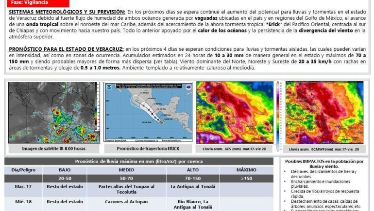 Xalapa, Ver., martes 17 de junio de 2025.- El Gobierno del Estado, a través del Sistema Estatal de Protección Civil (SEPC), da seguimiento al desarrollo de la Tormenta Tropical Erick, ubicada frente a las costas de Oaxaca y Guerrero en el Océano Pacífico, la cual mantiene esta noche lluvias intensas en el sur de Veracruz.